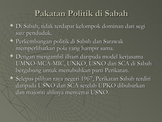 Pakatan Politik di Sabah danPakatan Politik di Sabah dan SarawakSarawak 15. Kejayaan BN di Semenanjung Sabah dan Sarawak untuk terus mengekalkan kuasa membuktikan kejayaan konsep dan amalan pakatan politik pelbagai etnik. Sejak penubuhan Malaysia kerjasama antara kelompok etnik di Sabah diwujudkan dengan pakatan antara pelbagai parti politik.