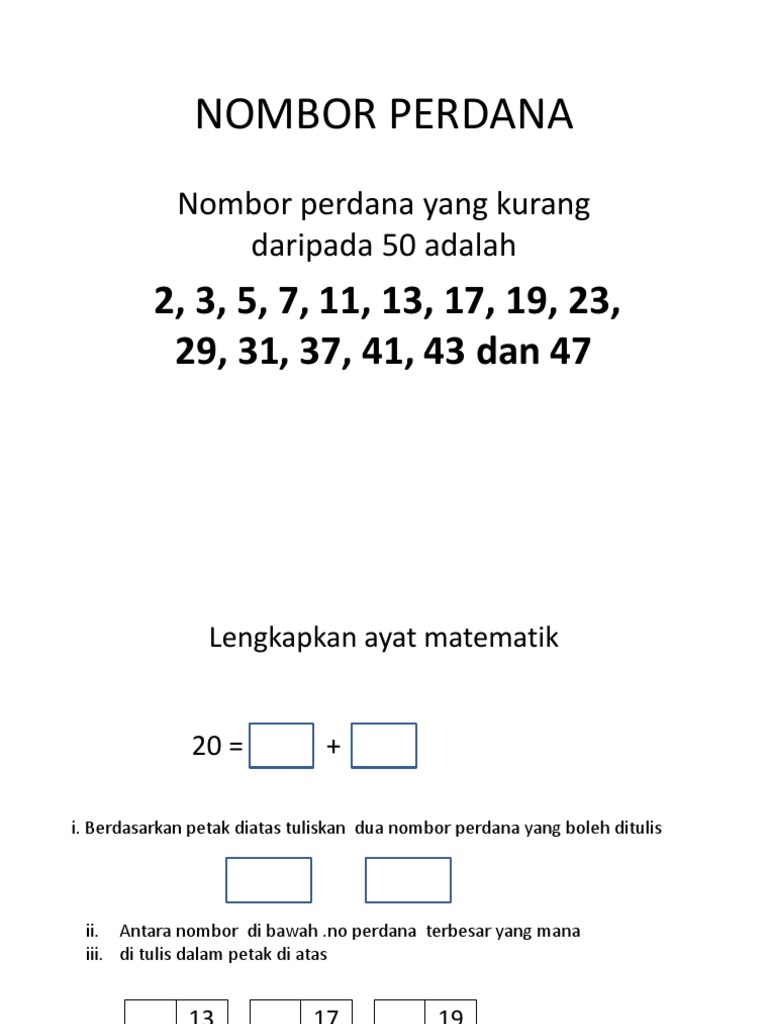 . 1st - 10th grade. Nombor perdana yang kurang daripada 50 adalah 2 3 5 7 11 13 17 19 23 29 31 37 41 43 dan 47. Play this game to review Mathematics.